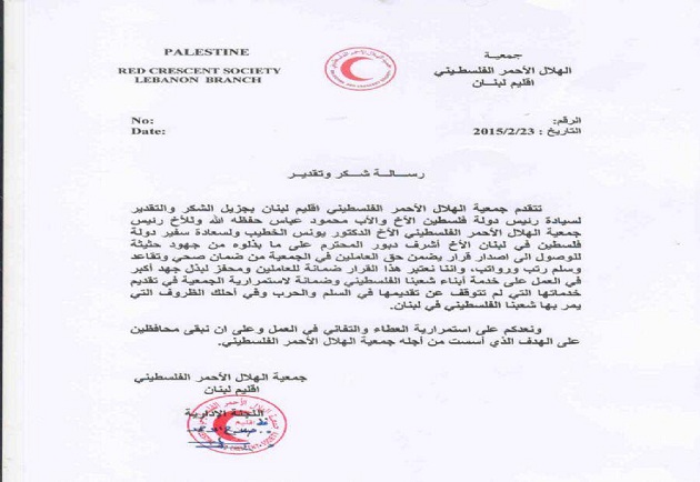رسالة شكر من جمعية الهلال الاحمر الفلسطيني للرئيس محمود عباس و لسفير دولة فلسطين في لبنان اشرف دبور