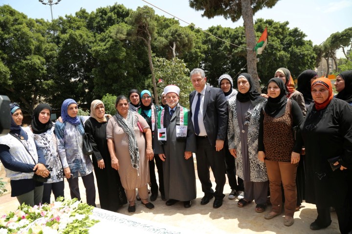 زار المفتي العام للقدس والديار المقدسة خطيب المسجد الأقصى الشيخ محمد حسين مثوى شهداء الثورة الفلسطينية عند مستديرة شاتيلا يرافقة سفير دولة فلسطين في لبنان اشرف دبور والمستشار الاعلامي حسان ششنية.