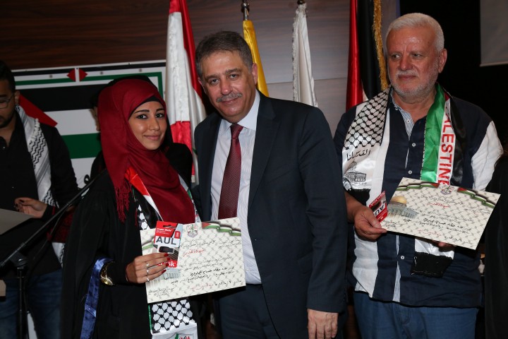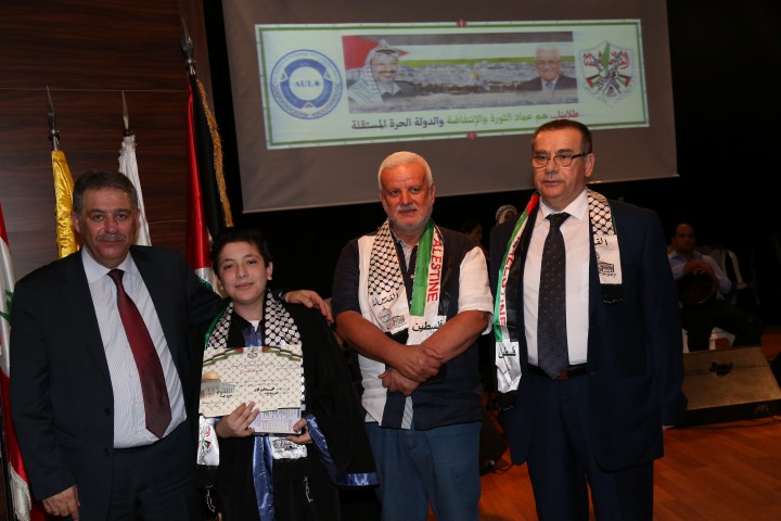 بيروت 6-8-2015 تكريماً للمسيرة التعليمية ودعماً وتشجيعاً، وتحت رعاية وحضور سعادة سفير دولة فلسطين في لبنان أشرف دبّور، أقام المكتب الطلابي الحركي في بيروت، بالتعاون مع جامعة AUL حفل تكريم الطلاب الفلسطينيين الناجحين في الشهادات الرسمية اللبنانية للعام الدراسي 2014 – 2015 وذلك في حرم الجامعة عند مستديرة الكولا، مساء الخميس 6/8/2015، تخلّل الحفل فقرات غنائية فولكلورية وتراثية فلسطينية قدمتها فرقتي حنين والبيادر.