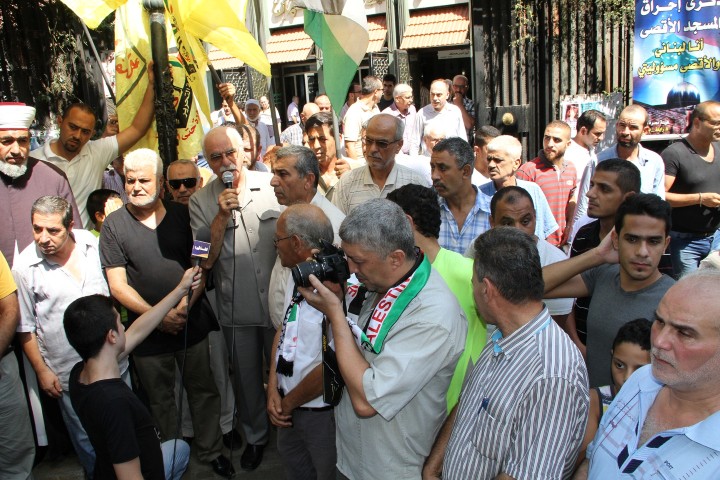 والقى الحاج رفعت شناعة كلمة جاء فيها: نحن اليوم امام استحقاق فيه الكثير من التعقيدات حكومة نتنياهو العنصرية التي تقوم اليوم بتنفيذ مخططها الذي يستهدف المسجد الاقصى، لم يكن غريباً ونحن لسنا متفاجئين ان تكون هذه المؤامرة في هذه المرحلة وان تستهدف هذا المسجد الذي هو ملك لكل العرب ولكل المسلمين... هو ليس فقط للفلسطينيين لكن شاء القدر ان يكون العرب نائمين وان يكون المسلمين بعيدين وان لا يكون في الساحة الا ابناء القدس. نتنياهو استغل ما يجري في الوطن العربي من نزاع وقتال وحروب تنتهي بالابادة البشرية وتدمير الاقتصاد والطاقات الشبابية الذي يجب ان يكون على ارض فلسطين وان يستشهد على ارض فلسطين وليست في الصراعات الداخلية العربية لكن هذه الاجواء التناحرية في الوطن العربي لا تخدم الا العدو الصهيوني، ليس رابح حتى الان المطلوب المزيد من القتل والتدمير في هذا الوطن نعم هذا هو المطلوب ولا بد ان نذكر بان العدو الاسرائيلي هو الرابح الوحيد حتى الان لأنه لم يخسر شيئاً هو في غاية السعادة لأن وطننا العربي ينزف والدم الفلسطيني ايضاً ينزف ونحن لنا الشرف ان ننزف دماءنا على ارضنا لأن هذه امنية كل واحد منا ان يموت ويستشهد هناك على ارضه وجهاً لوجه مع الاحتلال الاسرائيلي، معركة نخوضها يومياً في هذا الوقت الذي يعيشه العالم العربي الذي بدأ المشروع المتفق عليه في الكنيست الاسرائيلي والحكومة الاسرائيلية وهي تقسيم المسجد الاقصى بين اليهود والمسلمين بالقوة والصراع المباشر اليومي وهناك اساليب مختلفة تستخدمها حكومة نتنياهو العنصرية للضغط على الشعب المقدسي وعلى اهل فلسطين واهلنا الذين يقيمون في مناطق ال 48 لأنه علينا ان لا ننسى ان الذين يذهبون الى المسجد الاقصى يصلون ويتعبدون ويستمرون في البقاء طيلة الليل حتى يستقيظوا صباحاً ليتصدوا للمستوطنين لأن خطة نتنياهو التقسيم الزماني اي ان المستوطنين اليهود يأتون الساعة السابعة صباحاً ويبقون في المسجد حتى الساعة الحادية عشر. لذلك معظم اهلنا في القدس واراضي 48 هؤلاء يتحملون الاعباء ونحن نعتز ونفتخر بأن تنظيم حركة فتح يتحمل العبء الاكبر من المواجهة.