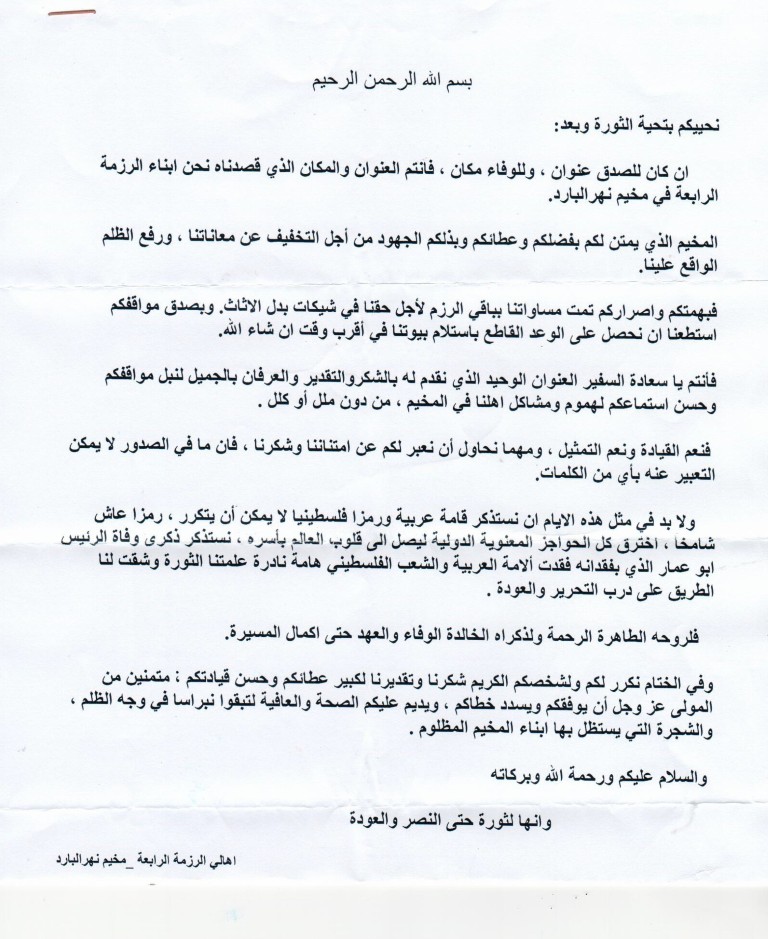 » رسالة شكر من أهالي الرزمة الرابعة للسفير دبور