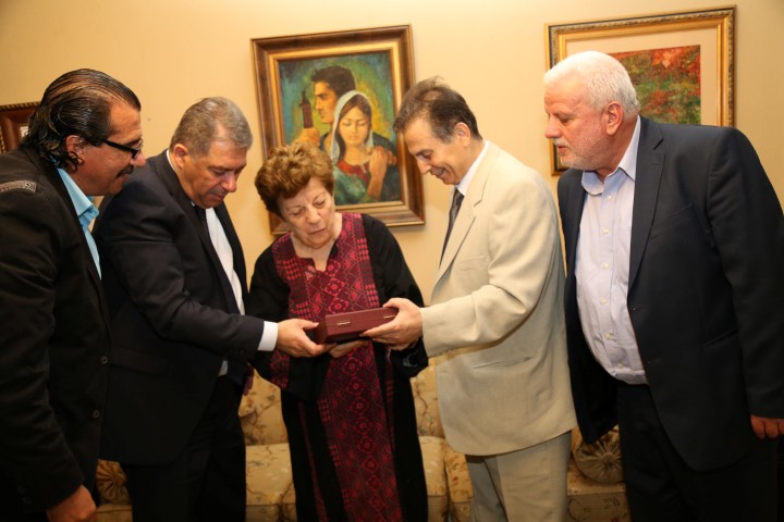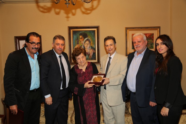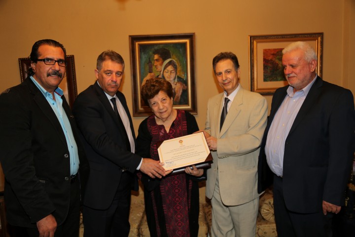 قدم الاخ عثمان ابوغرببة رئيس اللجنة الوطنية للقدس عاصمة دائمة للثقافة العربية /امين عام المؤتمر الوطني الشعبي للقدس للاستاذة المؤرخة القديرة بيان الحوت جائزة القدس للثقافة والابداع التقديرية للعام 2015 بناء على قرار اللجنة الوطنية للقدس عاصمة دائمة للثقافة العربية بحضور سفير دولة فلسطين في لبنان اشرف دبور وامين سر الفصائل الفلسطينية في لبنان فتحي ابو العردات والوكيل التنفيذي للمؤتمر الوطني الشعبي للقدس يونس عموري.
