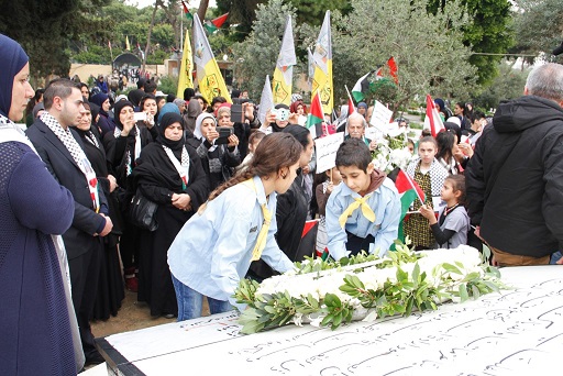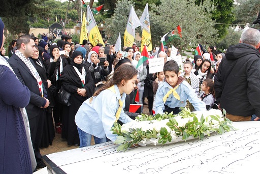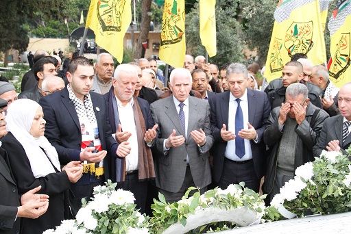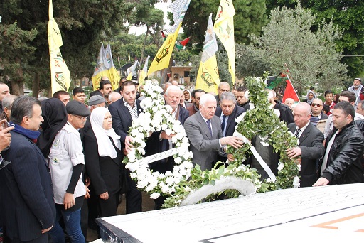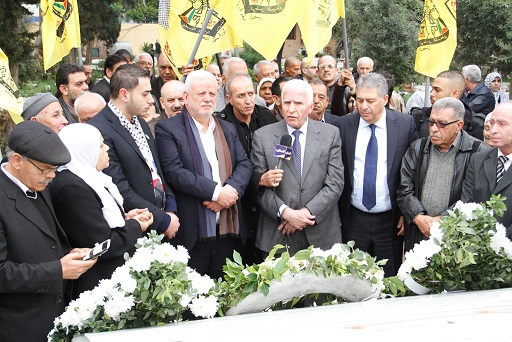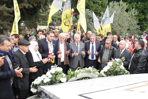 وتابع: يقف بيننا لاول مرة طارق ابن الشهيد زياد ابو عين الذي استشهد وهو يدافع عن الارض الفلسطينية في بلدة "ترمس عيا" قرب رام الله وجميعكم والعالم كله شهد كيف هذا الشهيد البطل تصدى لقوات الاحتلال المدججين بالسلاح وهو اعزل وسقط شهيداً امام الكاميرات وعلى شاشات التلفزة. أبو عين كان وزيراً في السلطة مسؤولاً عن مكافحة جدار الفصل العنصري والاستيطان. ويأتي احتفالنا في يوم الشهيد ونحن نحتفل في عموم الوطن وعموم الشتات لنحي ذكرى انطلاقة ثورتنا الفلسطينية اطول ثورة في التاريخ ولكننا مثل طائر الفنيق كما كان يقول شهيدنا الرمز ابو عمار نتجدد من تحت الرماد لا يمكن ان يقهر هذا الشعب مهما كانت قوة التحدي وقوة عدونا لآننا نمتلك ارادة الحق، نمتلك عدالة قضيتنا، نمتلك حقوقنا في ارضنا ومتمسكون بهذا الحق ولن نحيد عنه أبداً.
