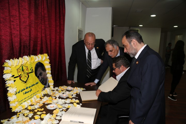 تقبلت سفارة دولة فلسطين في لبنان وحركة التحرير الوطني الفلسطيني فتح التعازي بالقائد المناضل عثمان ابو غربية عضو اللجنة المركزية لحركة فتح مفوض عام شؤون القدس ، في قاعة الشهيد ياسر عرفات.