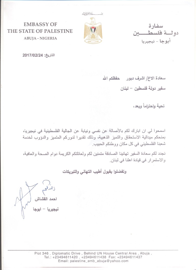 تلقى سفير دولة فلسطين في لبنان اشرف دبور ، رسالة تهنئة من سفير دولة فلسطين في نيجيريا احمد القشاش بمناسبة تقليده ميدالية الاستحاق والتميز الذهبية من قبل الرئيس محمود عباس اثناء زيارته الى لبنان بتاريخ 23-2-2017.