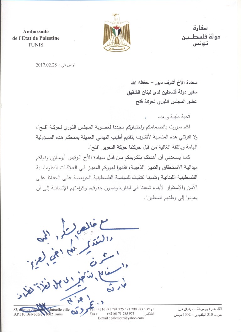 تلقى سفير دولة فلسطين في لبنان اشرف دبور ، رسالة تهنئة من سفارة فلسطين في تونس بمناسبة تقليده ميدالية الاستحاق والتميز الذهبية من قبل الرئيس محمود عباس اثناء زيارته الى لبنان بتاريخ 23-2-2017.