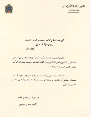 تلقى رئيس دولة فلسطين محمود عباس اليوم الخميس، برقية تعزية من المدير العام للامن العام اللبناني اللواء عباس ابراهيم باستشهاد القائد المناضل اللواء محمد الرازم "فتحي البحرية".