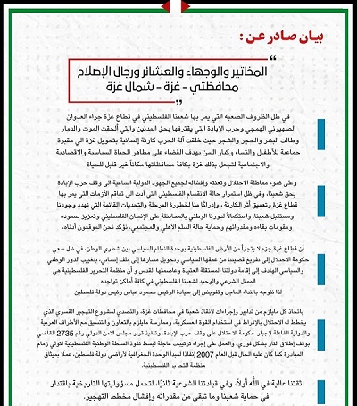 يأتي ذلك وفق، مخاتير ووجهاء وعشار محافظتي غزة وشمال غزة، على ضوء "مماطلة الاحتلال وتعنته وإفشاله لجميع الجهود الدولية الساعية إلى وقف حرب الإبادة بحق شعبنا، وفي ظل استمرار حالة الانقسام الفلسطيني التي أدت إلى تفاقم الأزمات التي يمر بها قطاع غزة وتعميق أثر الكارثة، وإدراكا منا لخطورة المرحلة والتحديات القائمة التي تهدد وجودنا ومستقبل شعبنا، واستكمالاً لدورنا الوطني بالمحافظة على الإنسان الفلسطيني وتعزيز صموده ومقومات بقاءه ومقدراتهم وحماية حالة السلم الأهلي والمجتمعي".