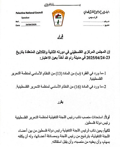 رام الله 24-4-2025 وفا- قرر المجلس المركزي الفلسطيني بالأغلبية الساحقة، الموافقة على استحداث منصب نائب رئيس اللجنة التنفيذية لمنظمة التحرير الفلسطينية، رئيس دولة فلسطين.
