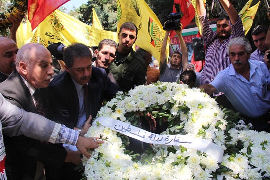 وتقدم المسيرة حملة الاكاليل ولافتات رفعها المتضمنون الاجانب والعرب وخلفهم سار حملة رايات الفصائل الفلسطينية مجتمعة واهالي الشهداء يحملون صور الضحايا.