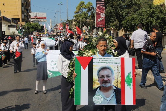 وأقامت اللجنة المنظمة للمسيرة معرض صور عن المجزرة التي ارتكبتها اسرائيل في ساحة قاعة الشعب أم متضامنون اجانب وحشد من المخيمات.