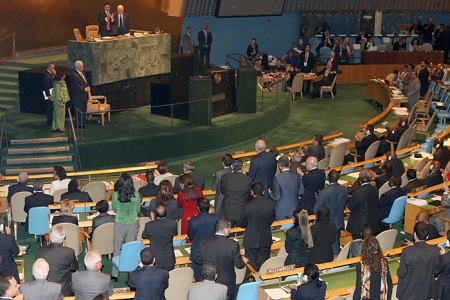 'امنعوا وقوع نكبة جديدة في الأرض المقدسة، وادعموا إقامة دولة فلسطين الحرة المستقلة الآن، ولينتصر السلام قبل فوات الأوان'، بهذه العبارات اختتم الرئيس محمود عباس خطابه أمام الدورة الـ67 للجمعية العامة للأمم المتحدة، والتي استقبلته بتصفيق حار دام نحو دقيقة، وأعلن فيها بدء مشاورات كي تعتمد الجمعية العامة قرارا يعتبر فلسطين دولة غير عضو في الأمم المتحدة.