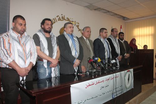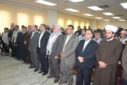 بداية النشيدين الوطنيين اللبناني والفلسطيني ثم تلاه كلمة لممثل نقيب الصحافة فؤاد الحركة، الذي نقل تأييد النقابة لكل الأعمال التي سيقوم بها التجمع "خدمة للقضية الفلسطينية وملاحقة لكل القضايا المعيشية وحق العمل والتملك للاجئين الفلسطينيين في لبنان".