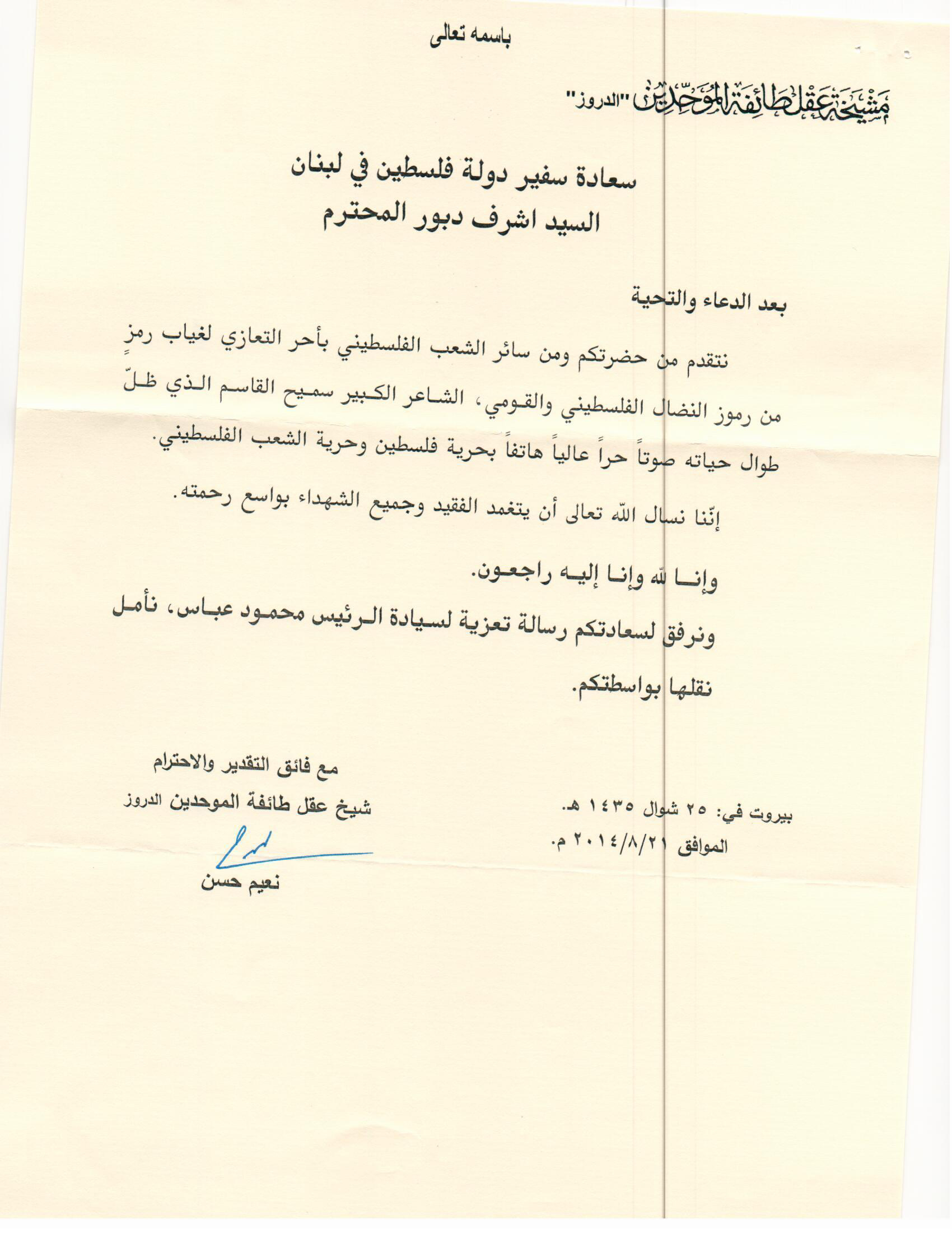 قدم شيخ عقل طائفة الموحدين الدروز نعيم حسن التعازي للسفير الفلسطيني في لبنان اشرف دبور، برحيل الشاعر الفلسطيني سميح القاسم.
