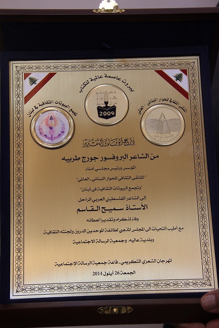 كرّمت اللجنة الثقافية في المجلس المذهبي لطائفة الموحدين الدروز المناضل الفلسطينيّ العربي الراحل الشاعر سميح القاسم في مهرجان شعري أقامته في عاليه بالتعاون مع بلدية عاليه وجمعية الرسالة الاجتماعية، حضره ممثل النائب وليد جنبلاط الوزير أكرم شهيب وممثل شيخ العقل الشيخ نعيم حسن الشيخ سامي أبي المنى، ممثل سفارة فلسطين في لبنان المستشار الثقافي ماهر مشيعل وممثل رئيس الأركان اللواء وليد سلمان المقدم وليد شيا والمدير العام لتعاونية موطفي الدولة يحيى خميس وممثل السيد علي فضل الله الشيخ حسين حركة والأميرة حياة أرسلان والمقدم شريف فياض والأستاذ أنور ضو ومفوض الإعلام في الحزب التقدمي الاشتراكي رامي الريس ومفوض الداخلية هادي أبو الحسن وبهاء أبو كروم ووكلاء داخلية الجرد وعاليه زياد شيا وخضر الغضبان والسفير السابق عاصم جابر والقاضي الشيخ مرسل نصر والقاضي الشيخ يحيى الرافعي والعمداء صلاح عيد وياسر محمود وطوني فرنسيس وعلي بو ناصيف وعدد من أعضاء المجلس المذهبي لطائفة الموحدين الدروز ومشايخ من مؤسسة العرفان التوحيدية ومن مدرسة الإشراق ومشايخ سنة وشيعة وموحدين والعديد من الشعراء والمثقفين وأبناء الجبل ومن مختلف المناطق.