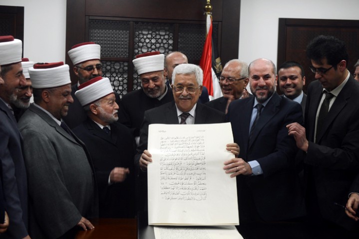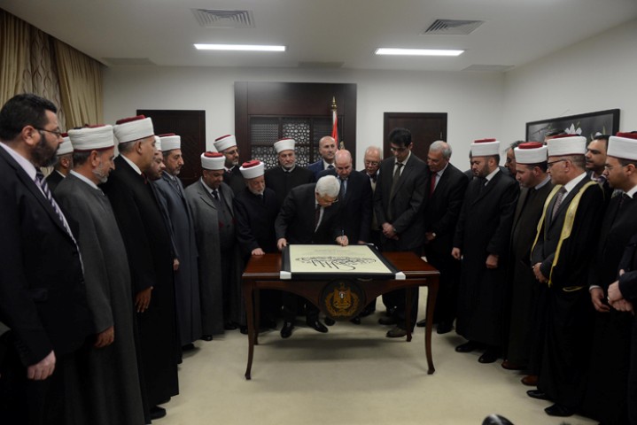 وجاء التوقيع في مقر الرئاسة بمدينة برام الله، بحضور أمين عام الرئاسة الطيب عبد الرحيم، ونائب رئيس الوزراء زياد أبو عمر، ومفتي القدس محمد حسين، ووزير الأوقاف والشؤون الدينية يوسف ادعيس، وقاضي القضاة مستشار الرئيس للشؤون الدينية والعلاقات الإسلامية محمود الهباش، وعدد من قضاة المحكمة العليا الشرعية.