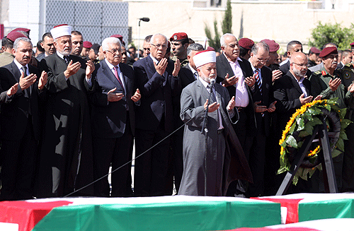 ومن ثم أدى السيد الرئيس والحضور صلاة الجنازة على أرواح الشهداء الذين سلمت رفاتهم للسلطة الوطنية الفلسطينية صباح اليوم الخميس بعدما دفنوا في 'مقابر الأرقام' لسنوات طويلة.