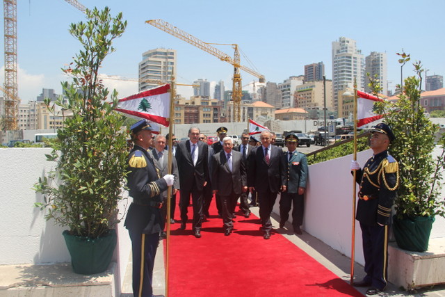 واستعرض سيادته ثلة من الحرس الجمهوري اللبناني، قبل أن يضع إكليلا من الزهر على نصب الشهداء، وعزفت موسيقى الجيش معزوفة الموت ولازمة نشيد الشهداء والنشيدين الوطنيين الفلسطيني واللبناني.