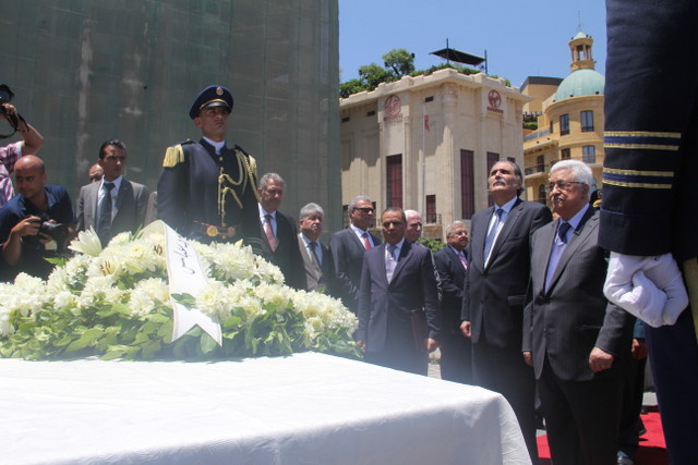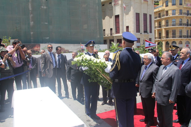 وضع رئيس دولة فلسطين محمود عباس، اليوم الخميس، إكليلا من الزهر على نصب الشهداء في ساحة الشهداء، وسط العاصمة اللبنانية بيروت.