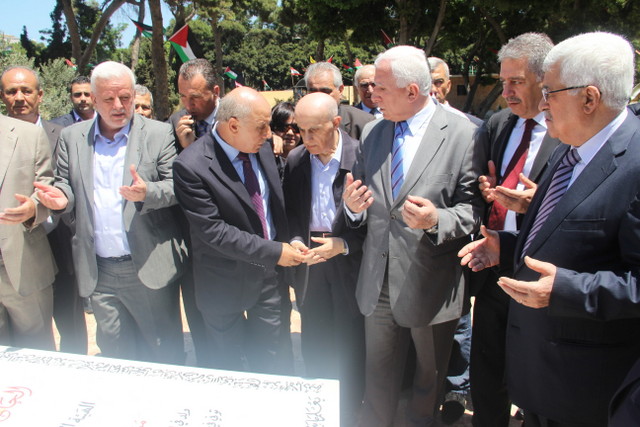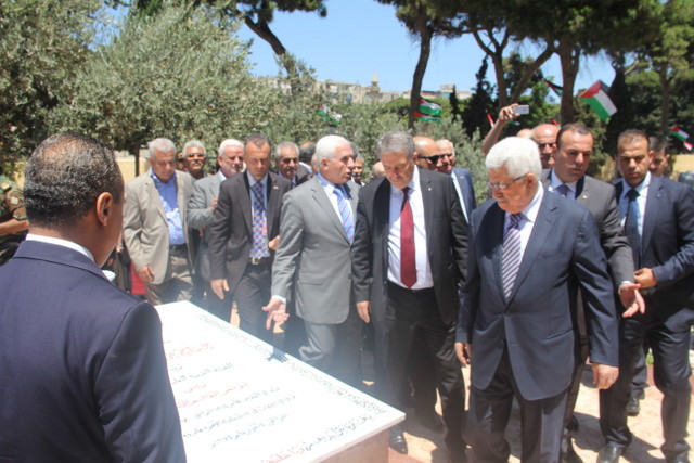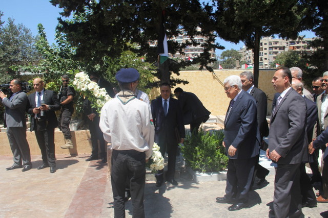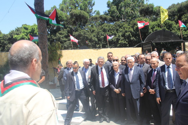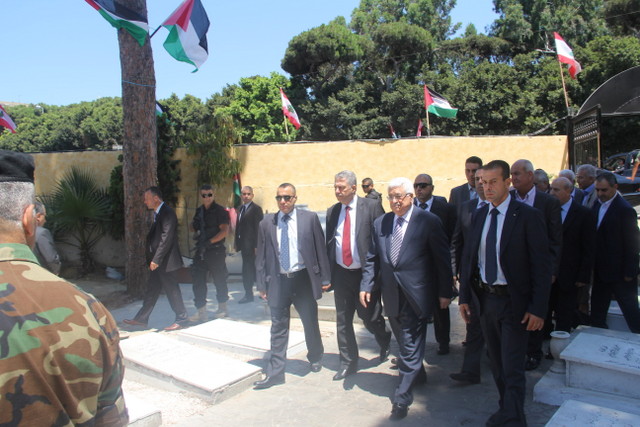 وضع رئيس دولة فلسطين محمود عباس، اليوم الجمعة، إكليلا من الزهور على النصب التذكاري لشهداء الثورة الفلسطينية في مقبرة شاتيلا في بيروت .