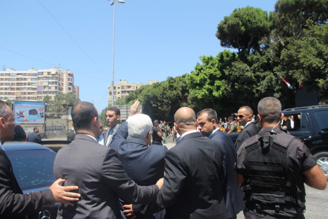 ورافق الرئيس عباس، عضو اللجنة المركزية لحركة فتح عزام الأحمد، ونائب رئيس الوزراء زياد أبو عمرو، ووزير العمل أحمد مجدلاني، والناطق باسم الرئاسة نبيل أبو ردينة، وسفير دولة فلسطين لدى لبنان أشرف دبور، ومستشار الرئيس للشؤون الدبلوماسية مجدي الخالدي، وأمين سر فصائل منظمة التحرير فتحي أبو العردات.