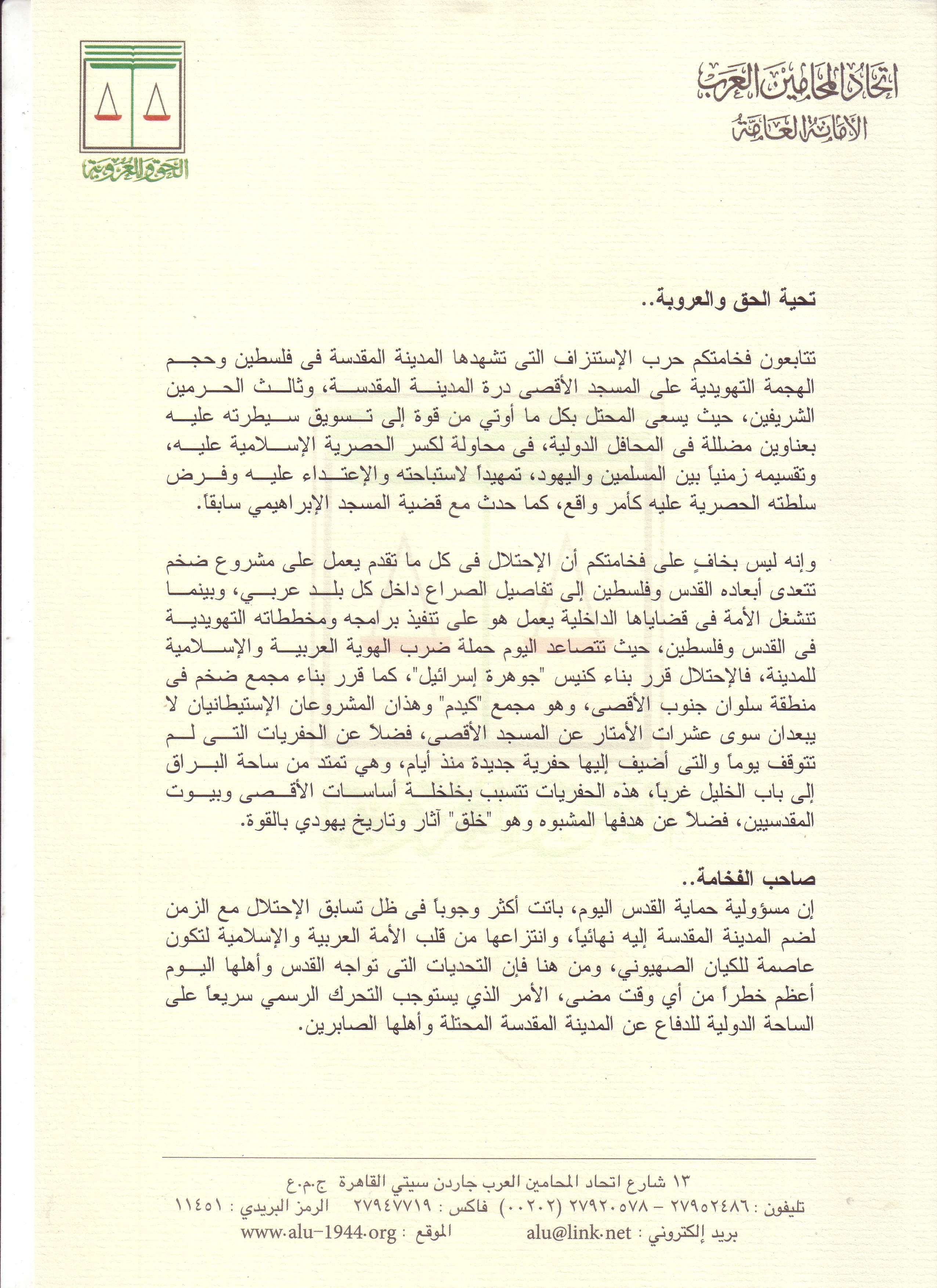 الاتحاد العام للمحامين العرب/ المحامي عمر الزين الى جميع ملوك وروساء الدول العربية والاسلامية بشأن الاعتداءات على المسجد الاقصى وعلى مدينة القدس والمقدسات الاسلامية والمسيحية