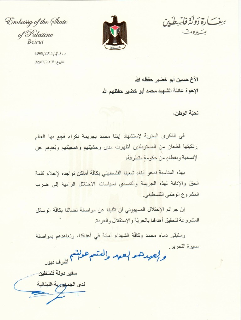 رسالة من سفير فلسطين في لبنان اشرف دبور الى عائلة الشهيد محمد ابو خضير