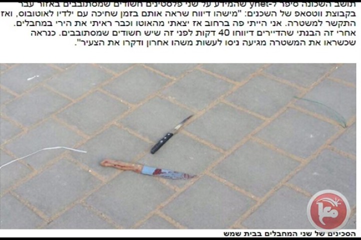 لم يقف الأمر عند هذا التناقض في الروايات بل في الصور التي نشرتها المواقع العبرية، فقد نشر موقع صحيفة "يديعوت احرونوت" صور متعددة لموقع ما تدعيه العملية، ويظهر في احدى هذه الصور السكاكين التي تم استخدامها حسب الموقع في العملية، واحدى السكاكين بلون اسود بها ثلاث نقاط بيضاء "براغي"، ولكن موقع صحيفة "nrg" العبري نشر ايضا صورة تظهر فيها سكين واحدة بلون اسود ولكنها لا تحمل أي نقاط بيضاء وبجانبها قفاز ابيض.