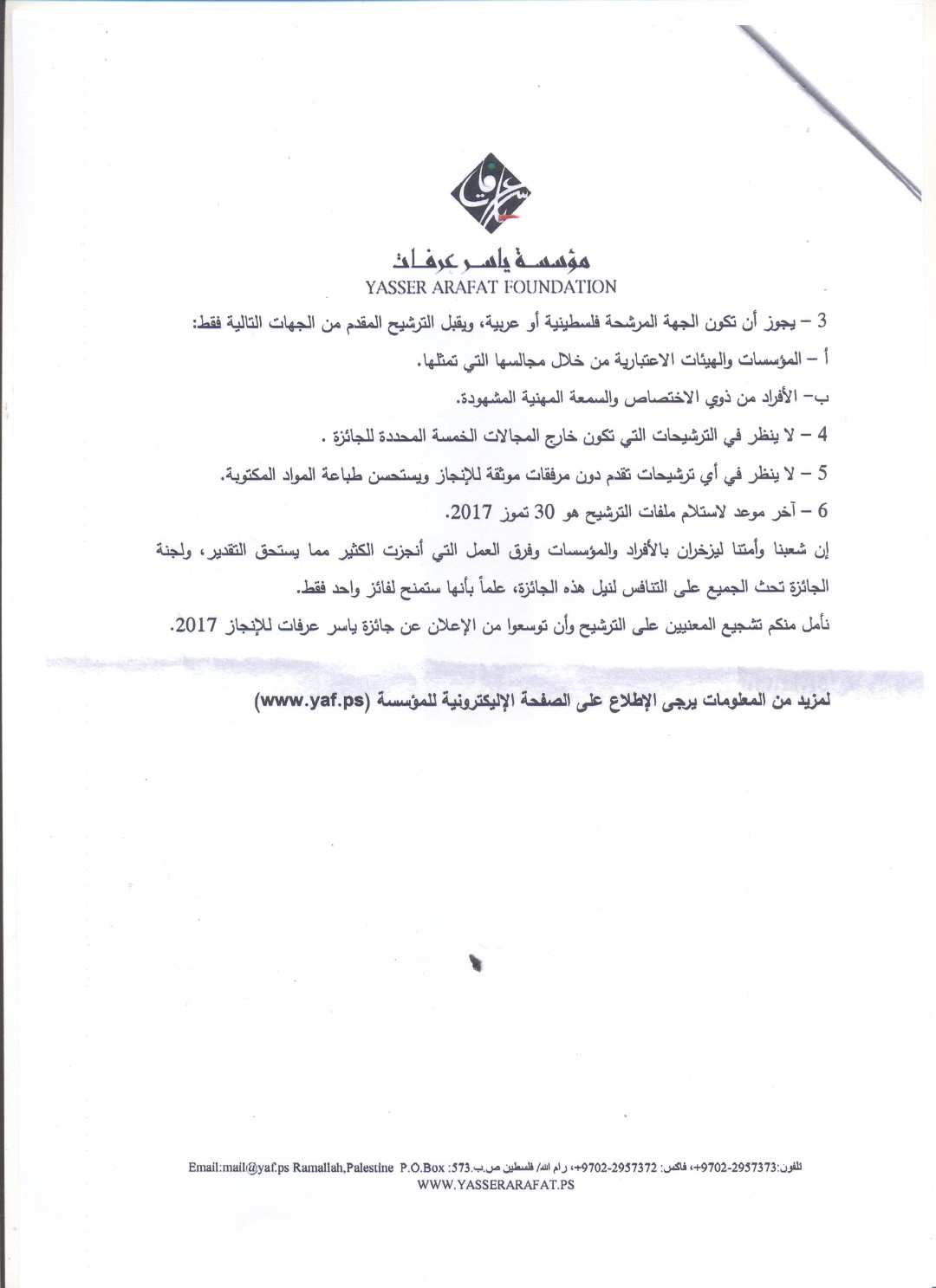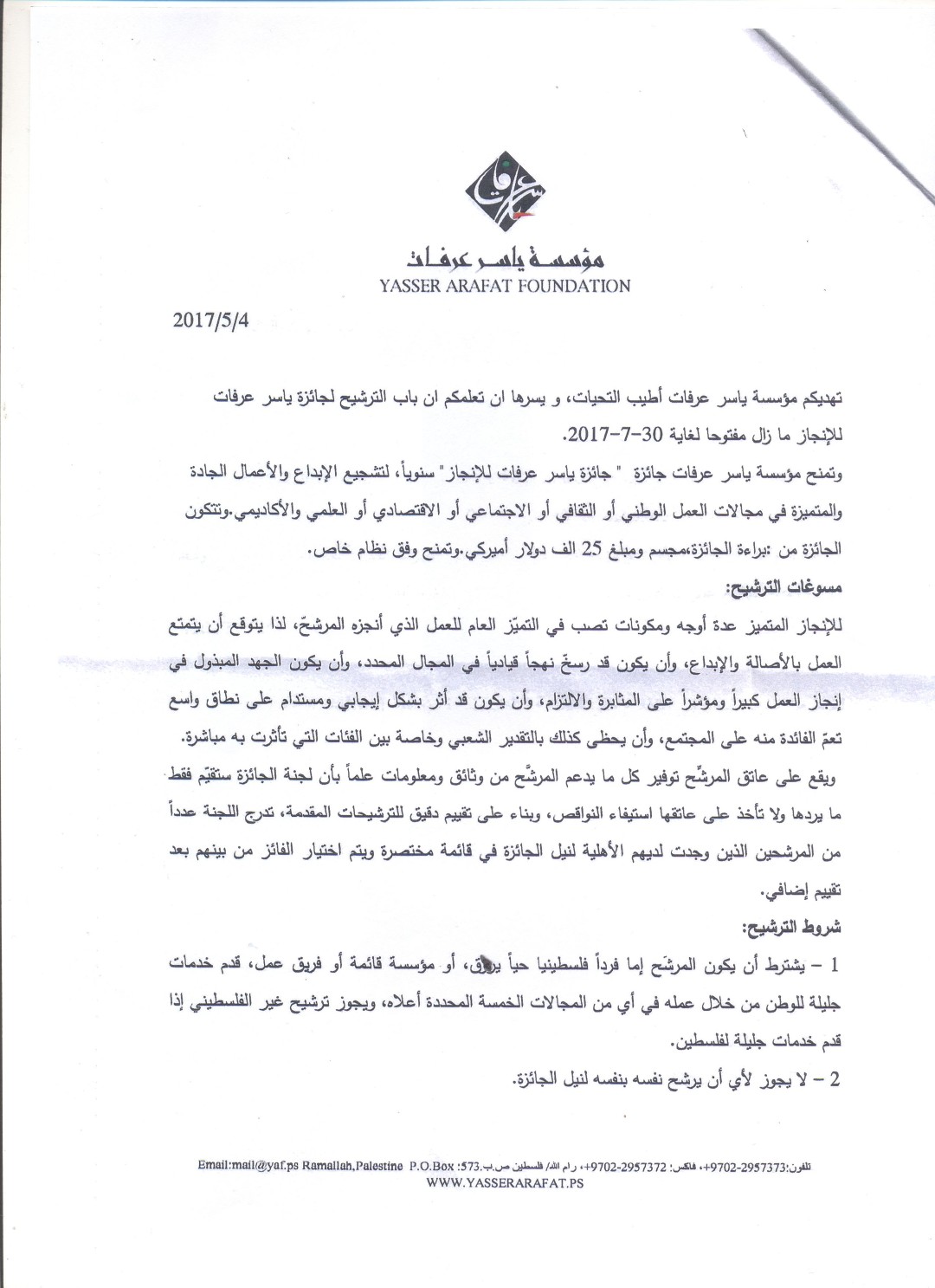 » الاعلان عن بدء الترشيح لنيل جائزة ياسر عرفات للانجاز للعام 2017