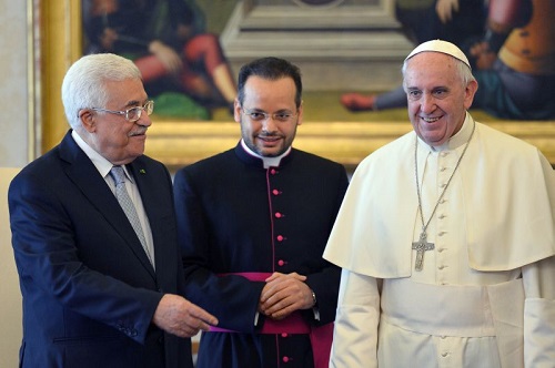 وكان قداسة البابا فرنسيس، قد اعترف بدولة فلسطين، ورفع العلم الفلسطيني في حاضرة الفاتيكان، كما زار مدينة بيت لحم، وكان في استقباله الرئيس محمود عباس، وصلى في كنيسة المهد، وتوقف عند جدار الفصل والتوسع العنصري وصلى دعماً للسلام وإنهاء الحروب، كما دعا إلى وقف الحرب على قطاع غزة، واصفا الوضع الإنساني الذي يعيشه الشعب الفلسطيني جراء الحرب الإسرائيلية بالمشين، كما طالب بعدم إغلاق مدينة القدس المحتلة أمام المؤمنين، وتطبيق الشرعية الدولية عليها.