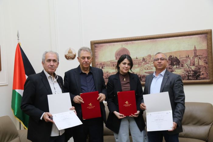 وسلم السفير دبور ياسين شهادة مقدمة من وزارة الاتصالات وتكنولوجيا المعلومات تقديراً لابداعها وموهبتها والتزامها الوطني في ابراز الوجه الثقافي الفلسطيني وتجذره في الارض الفلسطينية.